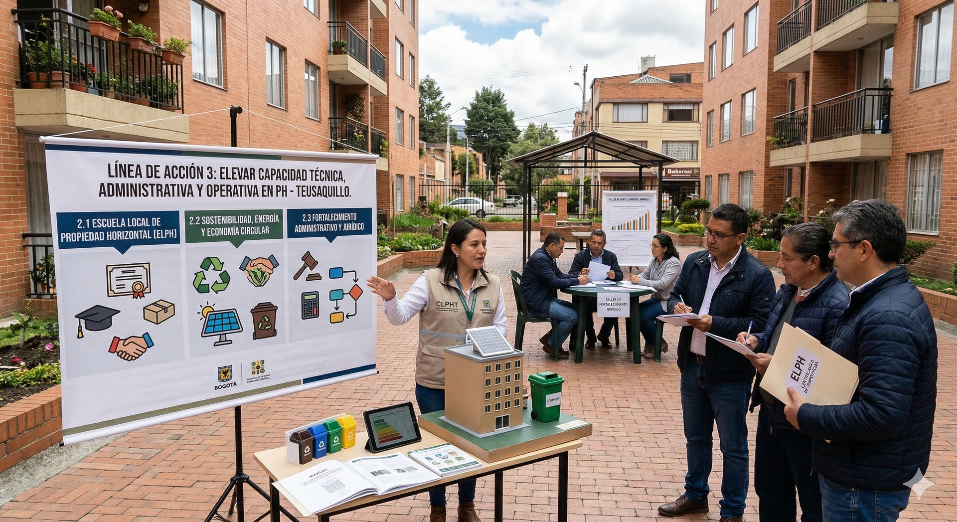 La Línea de Acción 3 tiene como finalidad elevar la capacidad técnica, administrativa y operativa de los administradores, consejos de administración y líderes comunitarios de la propiedad horizontal en Teusaquillo. Su eje central es la Escuela Local de Propiedad Horizontal (ELPH), complementada con programas especializados en economía circular, energía sostenible y buenas prácticas administrativas.